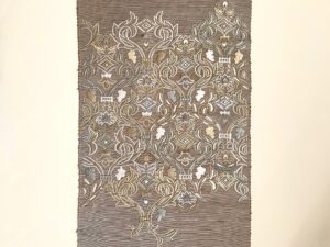★ 刺繍名古屋帯・・・刺繍する動力はミシンを使いますが、熟練の職人さんの技術、手動でミシンを扱い、下絵の図柄を描いています。