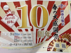 今年の3月21日、私ども岡藤呉服店山口店が今の店舗に移転して丸10周年を迎えることとなります。